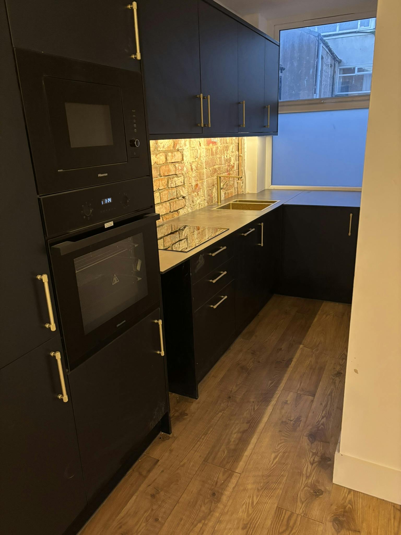 The kitchen; navy blue units with knurled gold handles and an exposed brick splashback, has; a built-in oven and microwave. Integrated dishwasher and also washer-dryer.